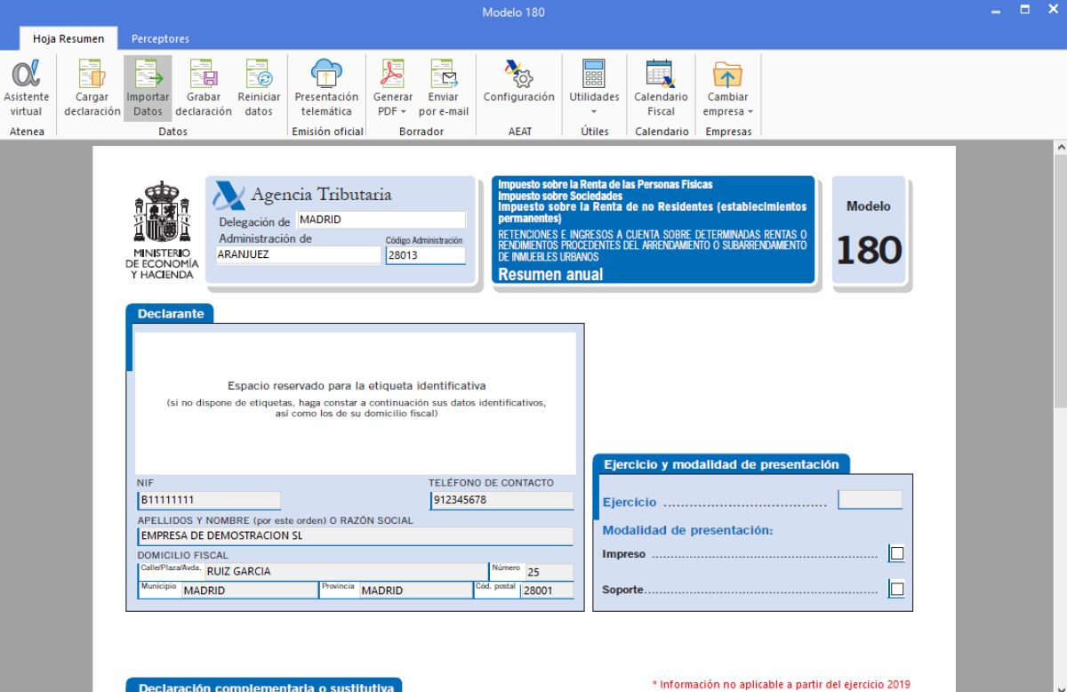 Una vez preparado el cuadro, se accede al formulario del modelo 180 en la Sede Electrónica de la Agencia Tributaria y se completan los datos identificativos del declarante, el ejercicio y el tipo de declaración (normal, complementaria o sustitutiva).